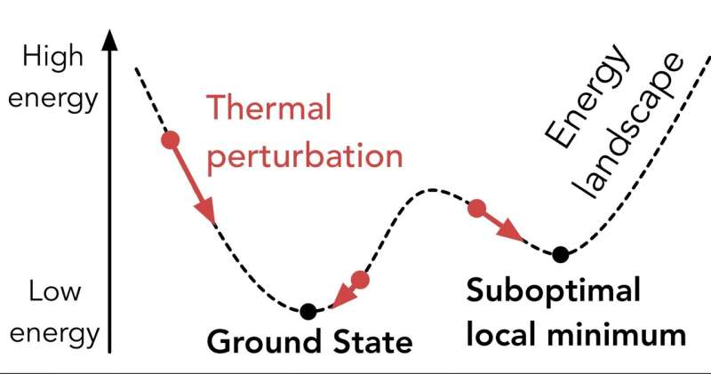 When one of these systems is placed in a thermal bath (i.e., an environment with a fixed temperature that interacts with the systems), it is known to cool down without always reaching its ground state. In some instances, a quantum system can get trapped at a so-called local minimum; a state in which its energy is lower than other neighboring states but not at the lowest possible level.