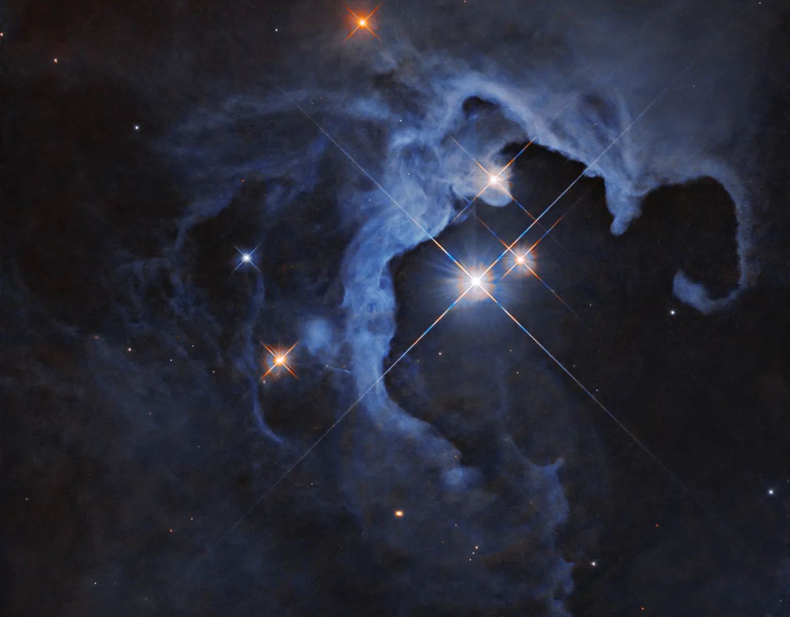 The image recently released shows a wonderful example of a reflection nebula 550 light years away in Taurus. These particular types of nebula are made up of interstellar dust that reflect light from nearby stars, unlike emission nebula which glow in their own right. They have a characteristic blue hue to them due to the reflective properties of the dust. Looking at the image you can easily imagine a hollowed out cavity in the nebula that has been carved by the young stars.