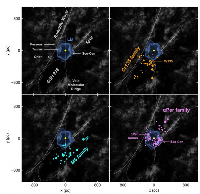 Our Solar System is also inside one of these bubbles, called the Local Bubble. Inside the bubble the gas is thinner and hotter than outside it. “The Local Bubble is probably also linked to the history of one of the three star cluster families,” adds Swiggum. “And it has likely left traces on Earth, as suggested by measurements of iron isotopes (60Fe) in the Earth’s crust.”