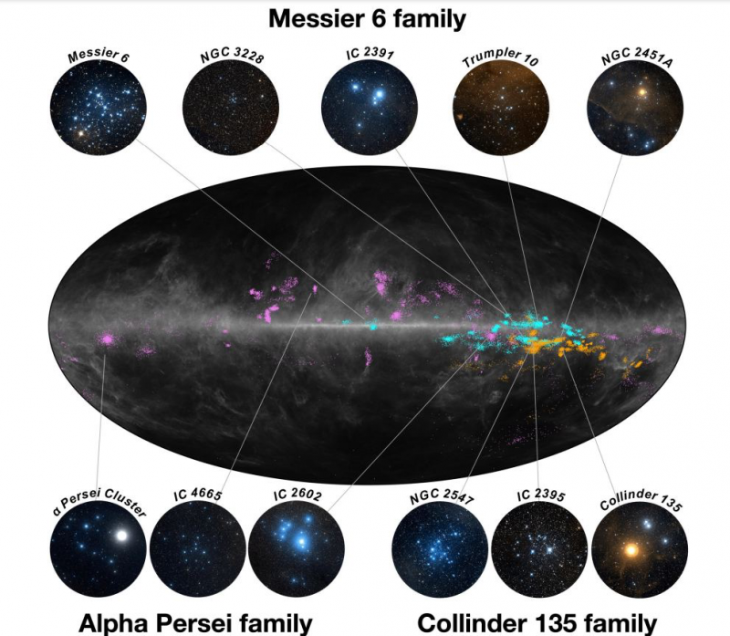 The researchers used Gaia data and spectroscopic observations of star clusters to trace their histories back over 60 million years. They uncovered three families of star clusters, each one associated with one of three star-formation regions. “This indicates that the young star clusters originate from only three very active and massive star-forming regions,” says Alves.