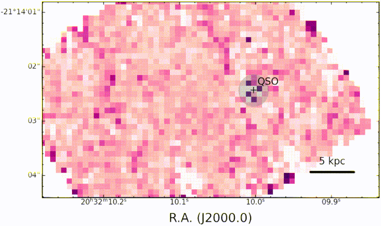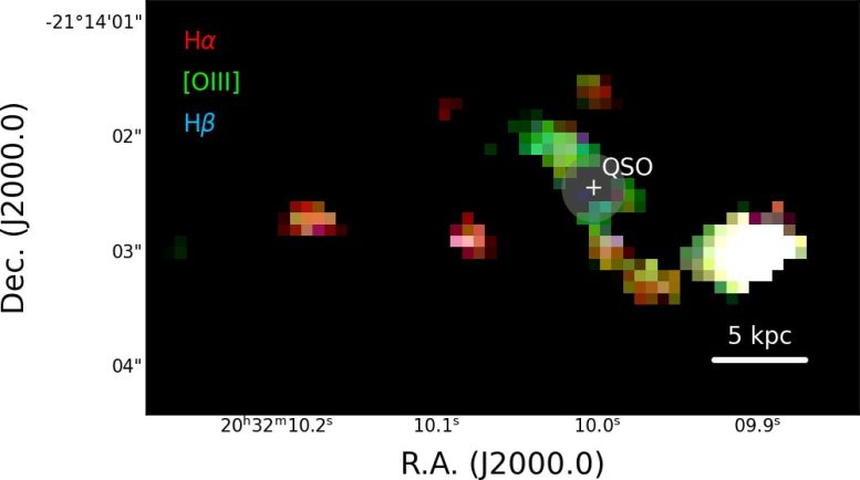 Map of the line emission of hydrogen (in red and blue) and oxygen (in green) in the PJ308-21 system, shown after masking the light from the central quasar (“QSO”). The different colors of the quasar’s host galaxy and companion galaxies in this map reveal the physical properties of the gas within them. Credit: Decarli/INAF/A&A 2024