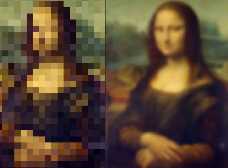 Classical computers are not capable of fully simulating the work of quantum systems, especially those with more than 30 qubits. As a hypothetical example, if a quantum computer were to create the Mona Lisa, it could create many of the details but is prone to errors, hence the blurry appearance of the painting on the right in this artist’s concept. A classical computer could not create the details as well as the quantum computer but could roughly approximate the task of the quantum computer, hence the pixelation of the image on the left. To get around this limitation and better simulate quantum systems, researchers used a method to change the amount of “pixelation” in a classical computer simulation and then extrapolate from those results to estimate the “blurriness” of quantum systems. Credit: Caltech
