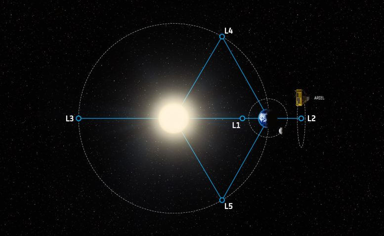 Ariel will be placed in orbit around the Lagrange Point 2 (L2), a gravitational balance point 1.5 million kilometers beyond the Earth’s orbit around the Sun. Credit: ESA/STFC RAL Space/UCL/Europlanet-Science Office