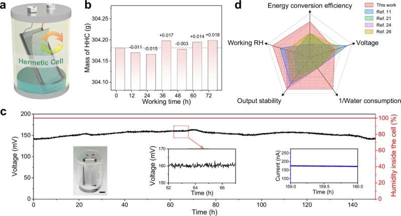 More information: Renxuan Yuan et al, Hermetic hydrovoltaic cell sustained by internal water circulation, Nature Communications (2024). DOI: 10.1038/s41467-024-54216-y