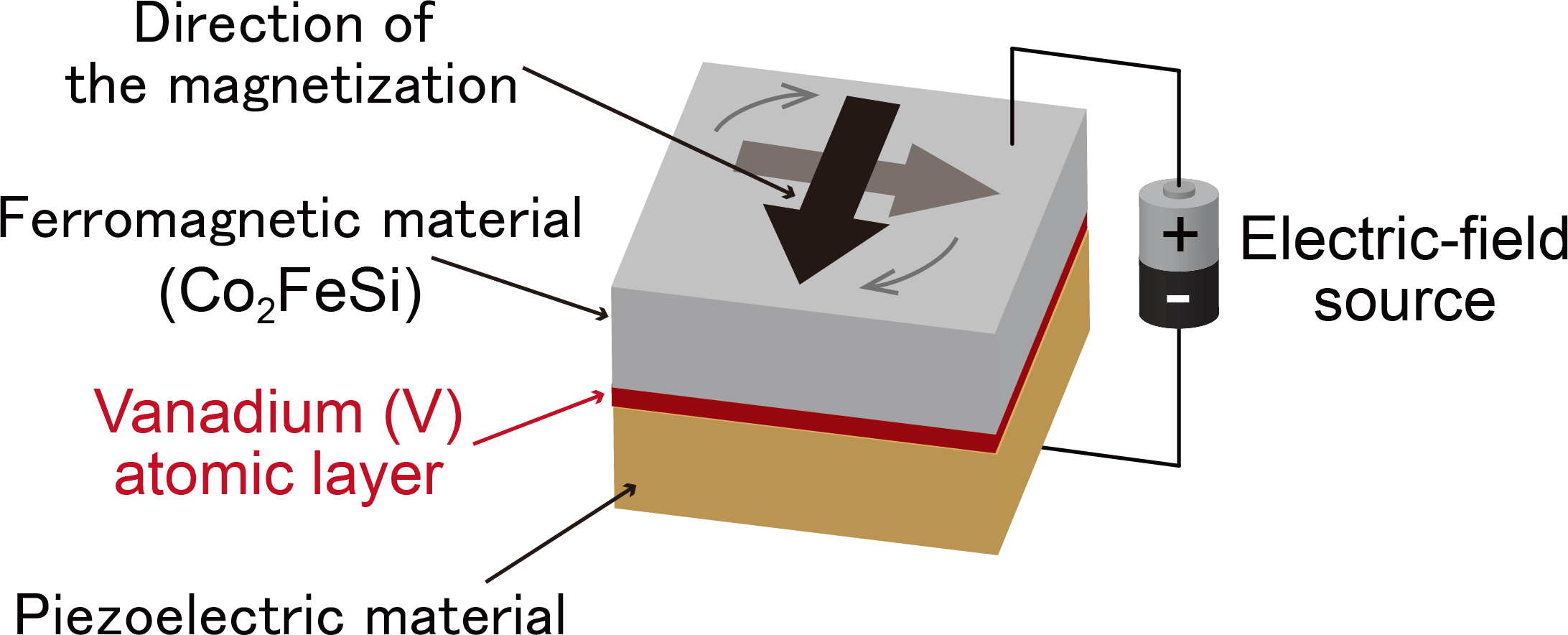 The researchers previously reported a multiferroic heterostructure with a large CME coupling coefficient over 10-5 s/m. However, structural fluctuations in parts of the ferromagnetic layer (Co2FeSi) made it challenging to achieve the desired magnetic anisotropy, hindering reliable electric-field operation. To improve the stability of this configuration, the researchers developed a new technology for an insertion of an ultra-thin vanadium layer between the ferromagnetic and piezoelectric layers. As shown in Fig. 2, a clear interface was achieved by inserting the vanadium layer, leading to the reliable control of the magnetic anisotropy in the Co2FeSi layer. Also, the CME effect reached a value larger than that achieved with similar devices that did not include a vanadium layer.