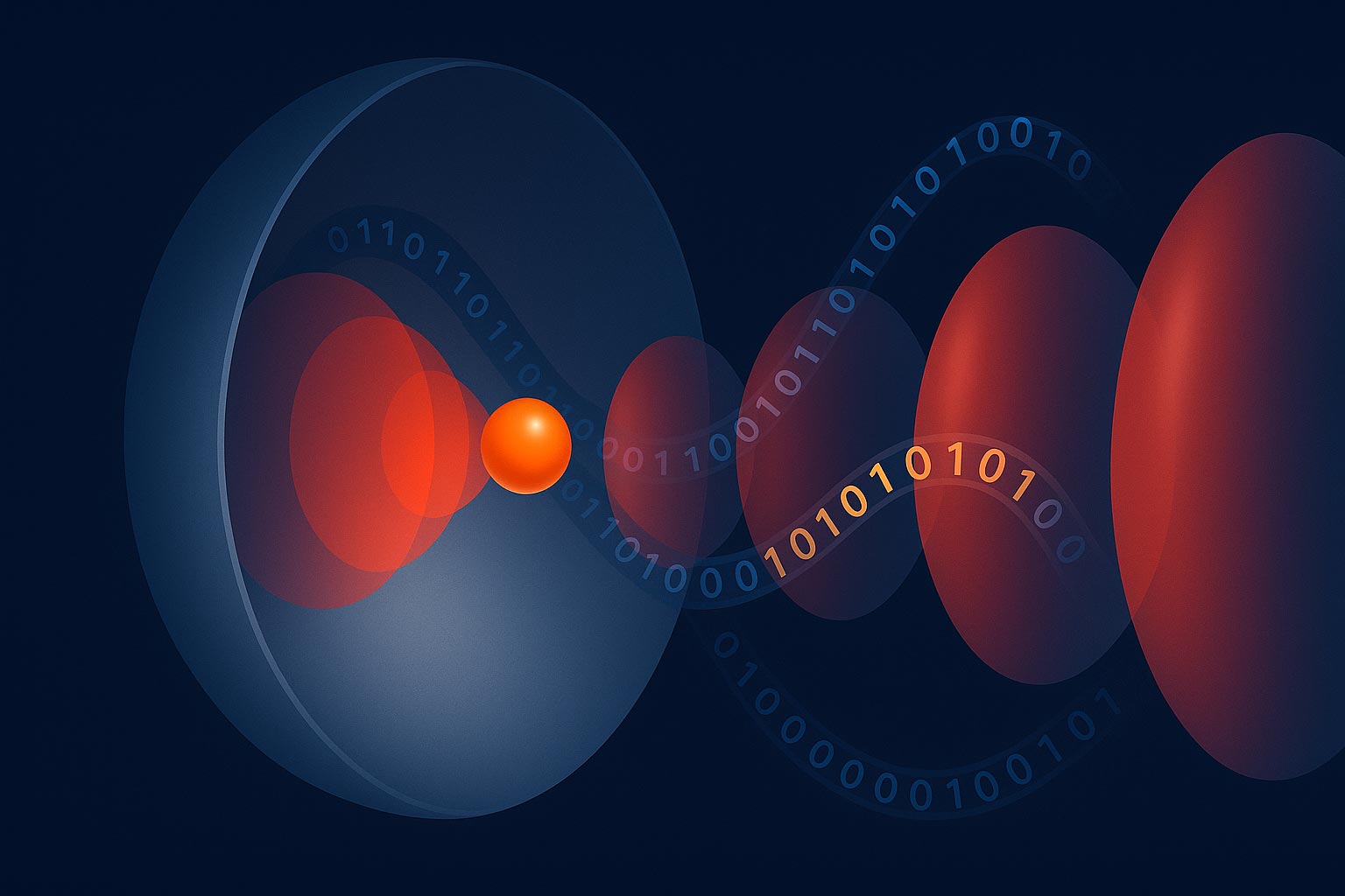 An illustration showing a standing light wave reflected from a curved mirror with a spherical particle at the centre. A stream of information, represented by 0s and 1s, emerges from the system. Credit: Dr. James Bateman