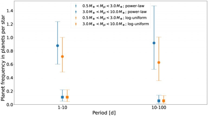 In their statistical analyses of the data, the researchers found that planets with less than three Earth masses are common around low-mass stars. “For planets below 3 M⊕ we found rates consistent with one planet per star across all investigated periods, but the rates decrease almost by an order of magnitude for larger planet masses up to 10 M⊕,” they write.