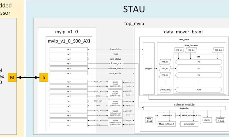 STAU was implemented on a Xilinx FPGA (VMK180) and controlled by an embedded Arm Cortex-R5 processor. This hybrid design allows developers to support a range of transformer models—including those used in LLMs—by simply updating software running on the processor, with no hardware modifications required.