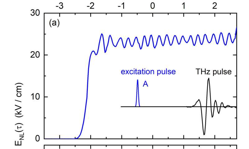 In the early phase of the localization process, collective coherent vibrations of the molecular cloud, so-called polarons, are excited, which manifest in a periodic modulation of optical absorption in the terahertz frequency range (1 THz = 1012 Hz = 1012 vibrations per second). The oscillation frequency is determined by the electron concentration in the liquid.