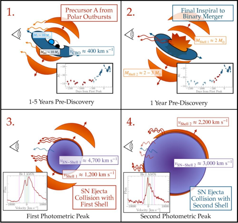This image explains how the binary system associated with SN2023zkd evolved. First, between 1 to 5 years pre-discovery, two polar pre-merger outbursts that each eject ∼2 solar masses from the system created the detected photometric variability. During the final year pre-discovery, runaway accretion leads to a tightening of the binary, emitting the early photometric rise. This is because of either increased accretion onto the black hole or an outburst from the star. Next is the first photometric peak, when the primary star merges with the black hole and explodes. The ejecta smashes into the first He-rich polar shell creating the first peak. Lastly, interactions with the second polar shell create the second light curve peak, before the SN interaction shell reaches the edge of the outer polar material and quickly dims. Image Credit: Gagliardi et al. 2025. ApJ