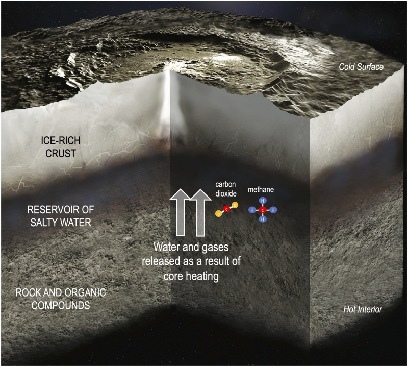 For their study, the authors created thermal and chemical models that mimic the temperature and composition of Ceres’ interior over time. They found that 2.5 to 4 billion years ago (roughly 500 million to 2 billion years after it formed), Ceres’ subsurface region may have had a steady hot water supply. This water was heated by the decay of radioactive elements in Cere’s rocky, metallic core when the planetoid was still young. Their analysis also showed that this water contained dissolved gases bubbling up from metamorphosed rocks at the core-mantle boundary.