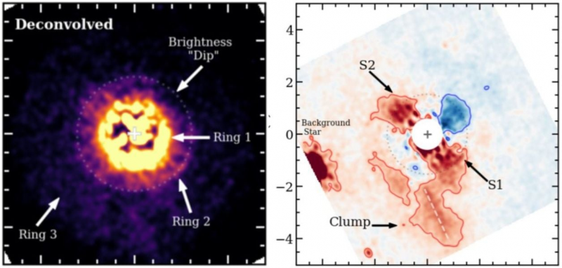 This pair of images was captured with the JWST (left) and the SPHERE instrument on the Very Large Telescope (right.) The JWST image shows three ring structures and a brightness dip, while the SPHERE image shows spiral arms (S1, S2) and a clump feature. Image Credit: Katie A. Crotts et al 2025 ApJL