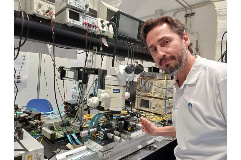 Francesco Morichetti, professor at DEIB—Department of Electronics, Information and Bioengineering of the Politecnico di Milano, and head of the university’s Photonic Devices Lab, inside his lab. Professor Morichetti contributed to the paper about the training of physical neural networks, along with an international team of colleagues. Credit: Politecnico di Milano