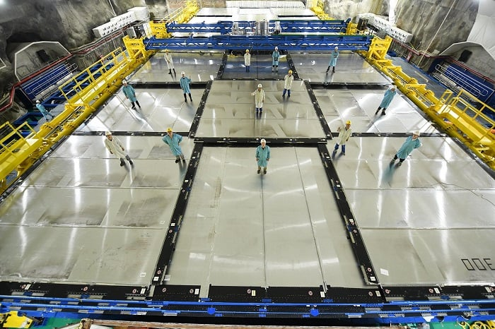 Even so, the detector itself is covered by an additional detector called the “Top Tracker”, which is covering a 44m diameter pool of ultrapure water. Its job is to detect any stray particle that might make it all the way down to the detector. Ultimately it can’t stop them, but it can eliminate the data artifact they might create.