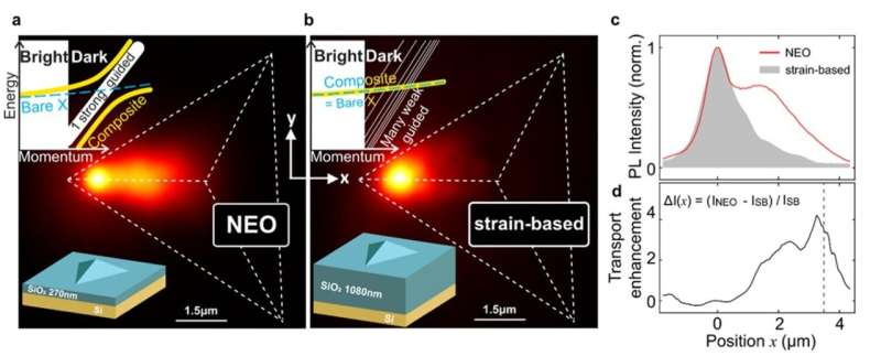 For the NEO device, the researchers harnessed excitons in a monolayer of tungsten diselenide (WSe2), a material with a binding energy high enough to keep excitons stable even at room temperature. The WSe2 layer was then placed on a carefully engineered silicon dioxide (SiO2) nanoridge with tapers.
