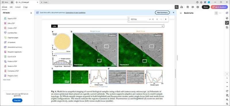 The researchers used the microscope to simultaneously acquire brightfield and fluorescence images of onion skin laid over a gently curved surface (a). Whole-sample images (b) were acquired in both brightfield and fluorescence modes under single-focus (left) and multi-focus (right) configurations. When all the cameras were forced to a single focal plane (single focus), the edges of the images are blurred. But when each camera was focused on the local curvature (multi focus), the entire curved layer stayed sharp. Fluorescence (c) and brightfield (d) zoom-ins and line profile, respectively, under single-focus (left) versus multi-focus (middle). Credit: Haitao Chen, Duke University