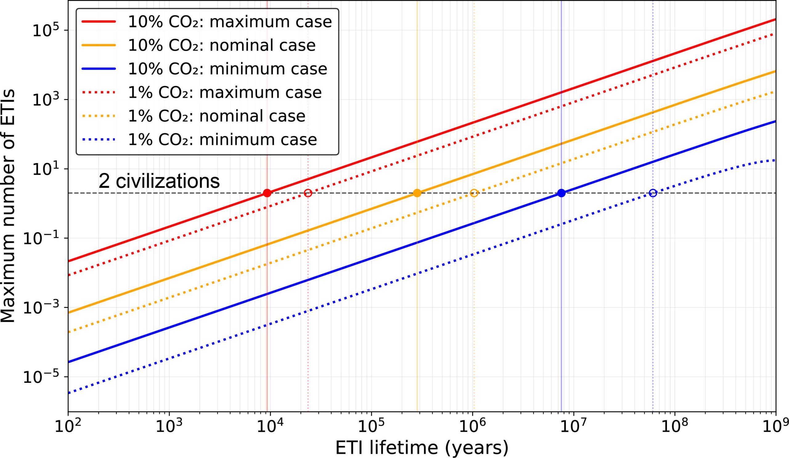 “For ten civilizations to exist at the same time as ours, the average lifetime must be above 10 million years,” says Scherf. “The number of ETIs is pretty low and depends strongly upon the lifetime of a civilization.”