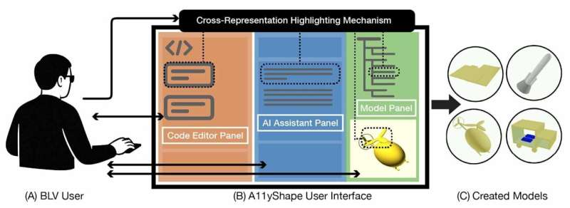 With A11yShape, (A) a blind or low-vision (BLV) user can create, interpret, and verify 3-D models through (B) a user interface composed of three parts: Code Editor Panel, AI Assistant Panel, and Model Panel. These panels are linked by a cross-representation highlighting mechanism that connects code, textual descriptions, hierarchical model abstractions, and 3-D visual renderings. The system supports the creation of (C) diverse, customized 3-D models created by BLV users. Credit: Study authors, CC 4.0