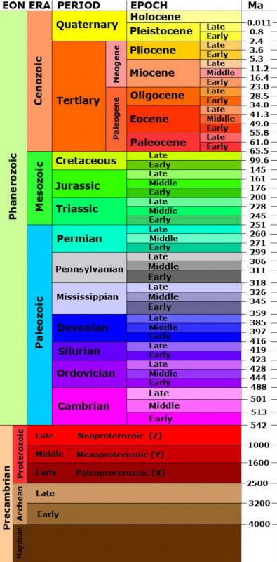 Geologic time scale covering the Precambrian and Phanerozoic eons with detail down to the epoch. The Archean Era can be seen to lower left (Credit : United States Geological Survey)