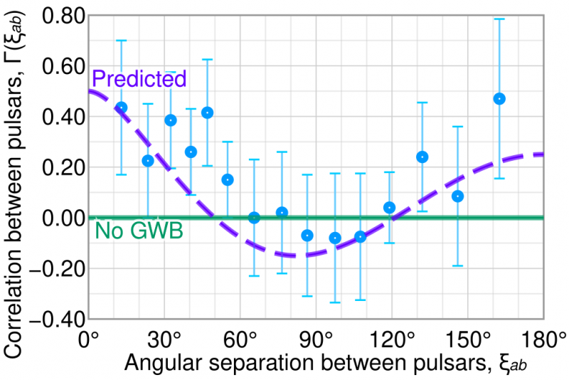 A graph showing how shifts in pulsar timings correlate with theoretical gravitational waves. Credit: Wikipedia user Cmglee CC BY-SA 4.0