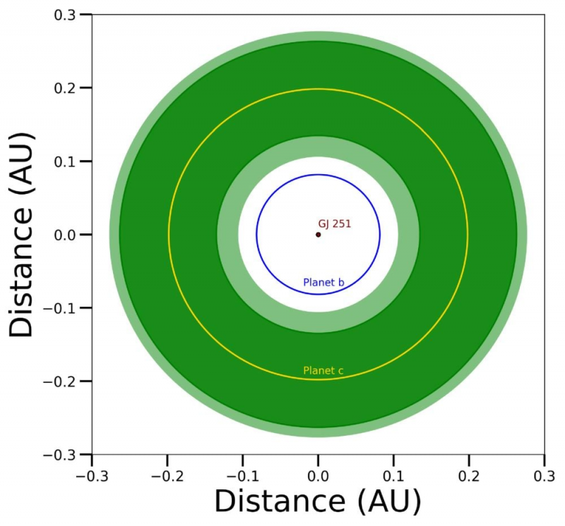 This graphic shows the GJ 251 system. It shows the star’s size and the orbits of the two exoplanets. The optimistic habitable zone is in light green, and the pessimistic habitable zone is dark green. GJ 251 c orbits where liquid water might be able to exist on its surface. Image Credit: Beard et al. 2025. AnJ