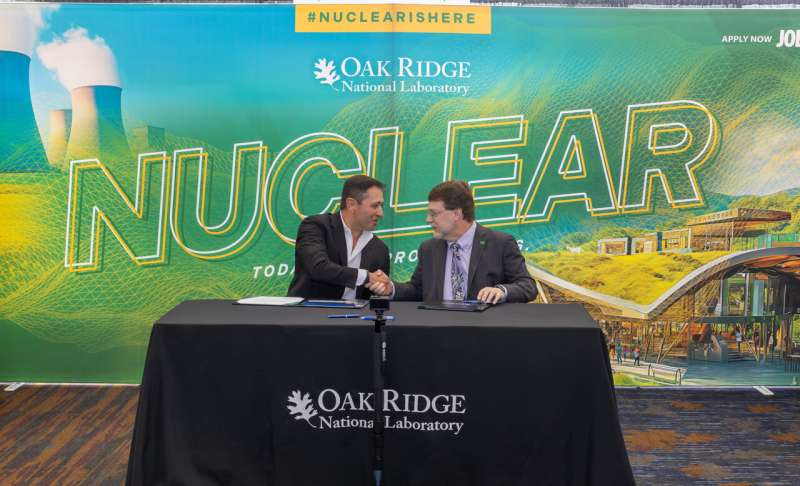 (Right) ORNL director Stephen Streiffer signs a memorandum of understanding with Atomic Canyon CEO Trey Lauderdale. Credit: Carlos Jones/ORNL, U.S. Dept. of Energy