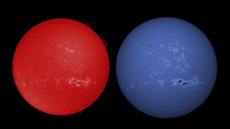 A massive sunspot graces Sol in 2025, as seen in hydrogen-alpha and calcium-k. Credit: Eliot Herman.