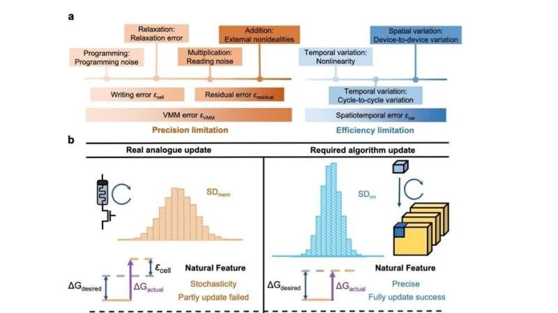Challenge of analog training. a: Limitations of memristor-based calculations. b: Distinction between the analog and algorithm-based training processes. Credit: J. Liu et al/Nature Communications. DOI: 10.1038/s41467-025-66240-7.