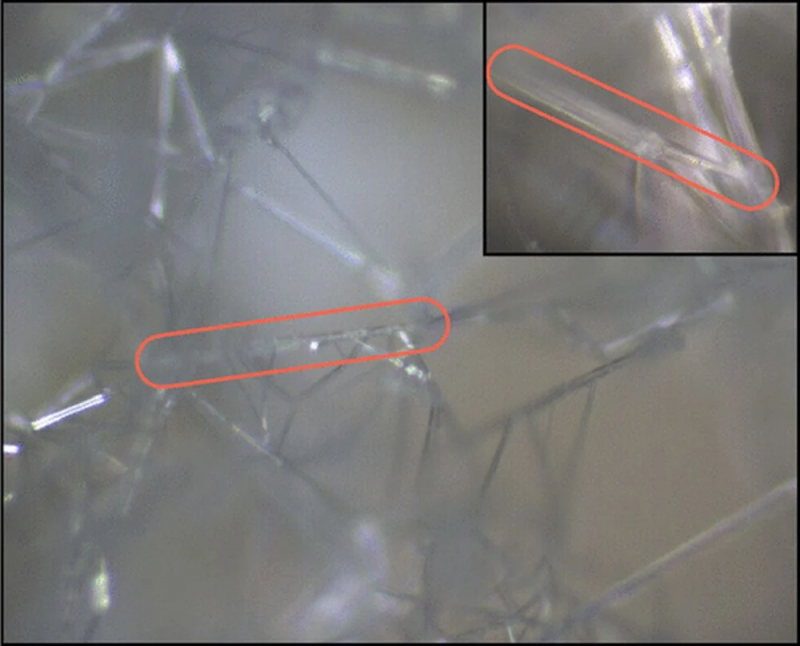 Microscope image of HCN crystals with 10× (full image) and 50× (top right inset) magnification. HCN crystallizes to high aspect-ratio needles (two are highlighted in red), which form a cobweb connectivity. Image Credit: NASA/JPL-Caltech.