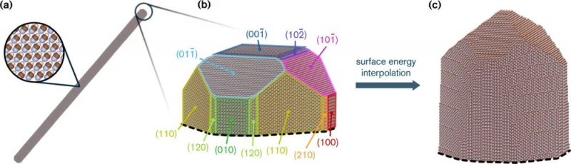 This figure illustrates the faceted surface on the end of an HCN crystal. The ends have strong electric fields that can encourage catalysis. Image Credit: Cappelletti et al. 2025. ACS Central Science