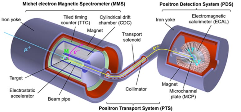 Key components include a high-intensity surface muon beam, a newly developed silica aerogel target optimized for muonium production, and an advanced detector system capable of separating an extremely rare signal from overwhelming background noise.