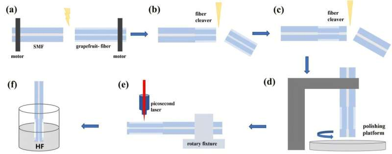 The all-fiber microphone was fabricated by using picosecond laser irradiation followed by a chemical etching process, which comprises six primary steps (SMF: single mode fiber, HF: hydrofluoric acid). Credit: Xiaobei Zhang, Shanghai University