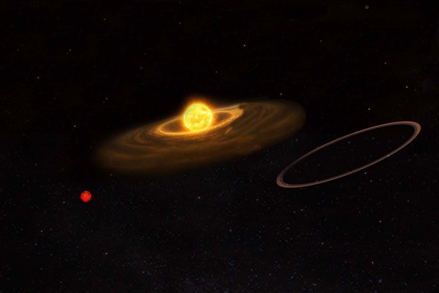 The proposed ring system is immense, stretching about 0.17 astronomical units from its central object. That distance is roughly half the span between the Sun and Mercury.