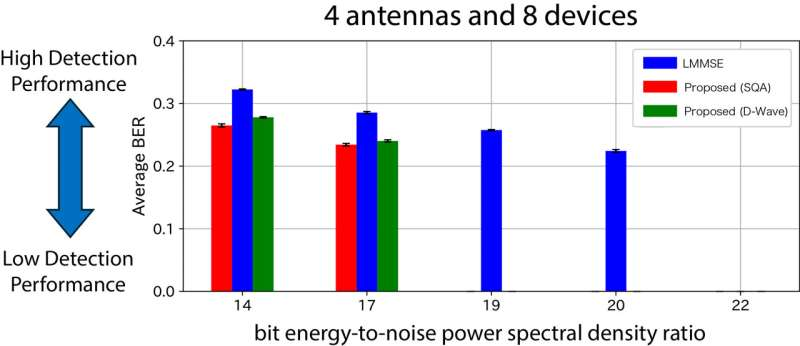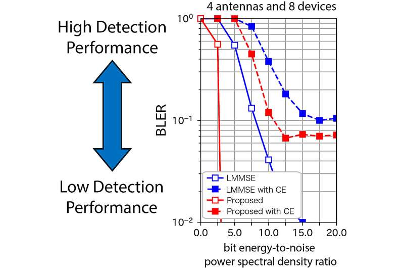 The team evaluated block-error-rate performance of the proposed method through numerical simulations under the following conditions: four receive antennas at the base station, QPSK modulation (M=4), and eight connected devices (K=8). This setting corresponds to a combinatorial optimization problem involving approximately 48 ≈ 60,000 possible signal combinations.