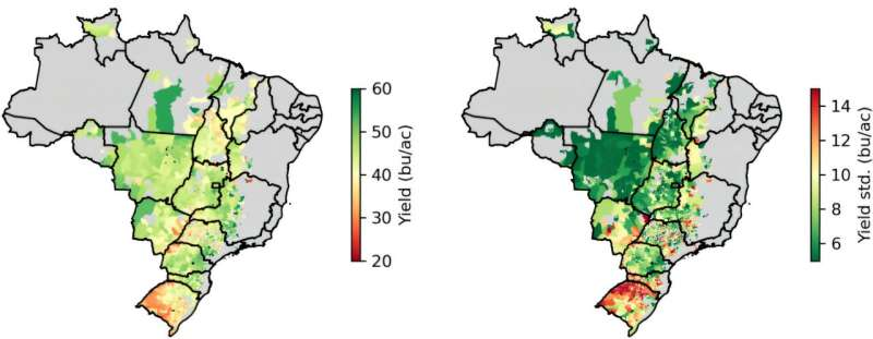 Spatial maps of the yield data show the harvested-area-weighted average soybean yield across all valid years for each municipality (left); and the standard deviation across all valid years in each municipality. Credit: International Journal of Applied Earth Observation and Geoinformation (2025). DOI: 10.1016/j.jag.2025.104981