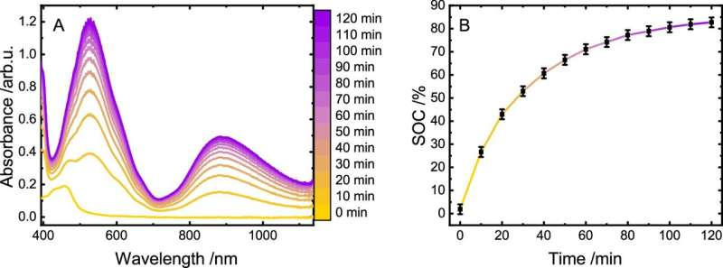 Charging process of the polymer. UV/vis absorption spectra during photocatalytic charging of the copolymer (225 µm with respect to methyl viologen monomer content) using [Ru(tbbpy)3]Cl2 (12.5 µm) in water containing 0.09 m TEA and 0.075 m NaH2PO4 (A) and the respective time course of charging (B). SOC refers to state of charging; mean values are displayed and error bars represent standard deviation of n = 3 independent measurements. Credit: Nature Communications (2026). DOI: 10.1038/s41467-026-68342-2