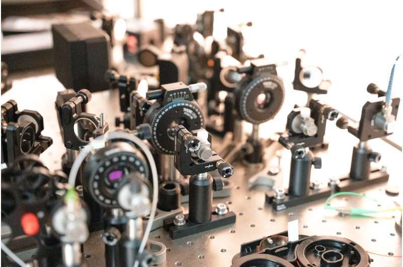 Part of the optical experiment used to study quantum color centers in silicon. Credit: Kazemi et al.