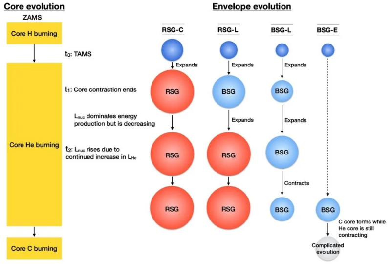 This schematic illustrates some of the findings in the first paper. A star’s size at the end of its main-sequence phase—the terminal-age main sequence (TAMS)—determines whether it becomes a red or blue supergiant. Stars that are already relatively large at the TAMS can undergo substantial envelope expansion and evolve into red supergiants. In contrast, more compact stars remain blue supergiants and eventually contract rather than expanding further. Image Credit: ASIAA/Po-Sheng Ou