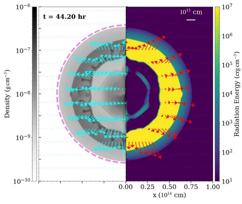“This study presents the first ever two-dimensional multigroup radiation-hydrodynamic models of red supergiant shock breakout, revealing that radiation precursors and circumstellar density significantly shape the breakout light curves and color evolution,” lead author Wun-Yi Chen said.