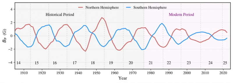 To apply these older observations with modern activity, the team turned to observations from the joint NASA/European Space Agency’s Solar Heliospheric Observatory. Launched in 1995, SOHO has now observed the Sun for over a quarter of a century now. This is more than one Hale Cycle, which is equal to 22 years (two 11-year solar cycles), the time it takes the hemispheres of the Sun to flip and return back to the same polarity.
