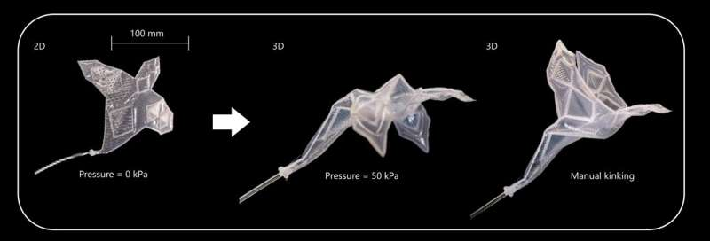 An artistic example of a soft inflatable animal fabricated using our method. An inflatable bird (internal pressure of 50 kPa) with kinking wings, demonstrating reconfiguration of its flight posture while inflated. Credit: Rezanejad et al, 2026.
