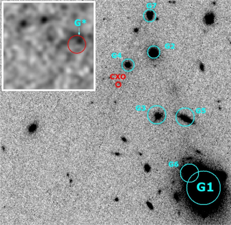 This Hubble image shows the GRB 230906 field. The red circle is where the Chandra localized the GRB. A zoom-in on the putative host galaxy is shown in the upper left insert. The other galaxies are labelled in order of the likelihood that they hosted the neutron star merger, with G1 being most likely. Unmarked galaxies have an extremely low probability of being the host. Note that the tidal stream is not visible in this image. Image Credit: Dichiara et al. 2026. ApJL