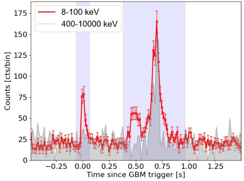 This is the Fermi/GBM light curves of GRB 230609A in two energy bands: 8–100 keV are hard x-rays and 400–10,000 keV is gamma-rays. The purple shaded regions highlight the first peak and the main episode. Image Credit: Dichiara et al. 2026. ApJL