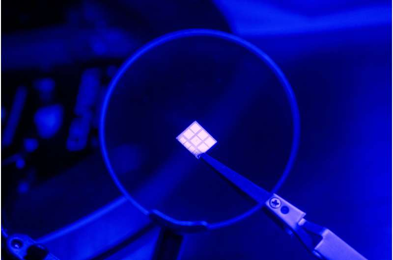 A chiplet cut from the wafer containing a set of arrays from the spatiotemporal processing layer. Credit: David Baillot/UC San Diego Jacobs School of Engineering