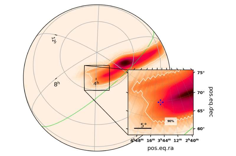 GW skymap of LVK S241125n and the GRB location. The color bar of the skymap represents the relative probability density of the GW source location. The white solid line represents the 90% confidence level contour, while the blue cross in the inset indicates the position of the candidate electromagnetic counterparts. The green curve indicates the Galactic plane. Credit: The Astrophysical Journal (2026). DOI: 10.3847/1538-4357/ae3319