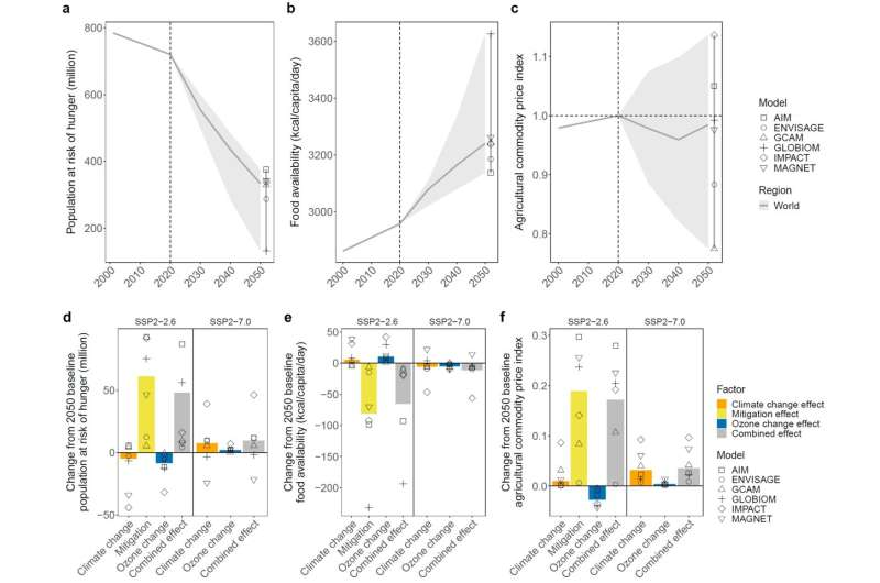 Global population at risk of hunger (a), global mean food availability (b), and food prices (c) in the baseline scenario, and, as differences from the 2050 baseline estimate, the effects of climate change alone, climate mitigation policies, and the associated ozone reduction on the global population at risk of hunger (d), global mean food availability (e), and food prices (f). The combined effect represents the sum of the effects of these three drivers. Shaded areas in (a–c) indicate inter-model uncertainty, whereas bars in (d–f) show the median across the six models. Markers denote individual model results. Credit: Shujuan Xia, Tomoko Hasegawa, Thanapat Jansakoo, Daniel Mason-D’Croz, Kazuaki Tsuchiya, Shinichiro Fujimori, Maksym Chepeliev, Marta Kozicka, Abhijeet Mishra, Willem-Jan van Zeist, Xin Zhao, Thijs de Lange, Thais Diniz Oliveira, Jonathan C. Doelman, Matthew Gibson, Petr Havlik, Mario Herrero, Ipsita Kumar, Yuki Ochi, Timothy B. Sulser, Marina Sundiang, Kiyoshi Takahashi, Jun’ya Takakura, Keith Wiebe