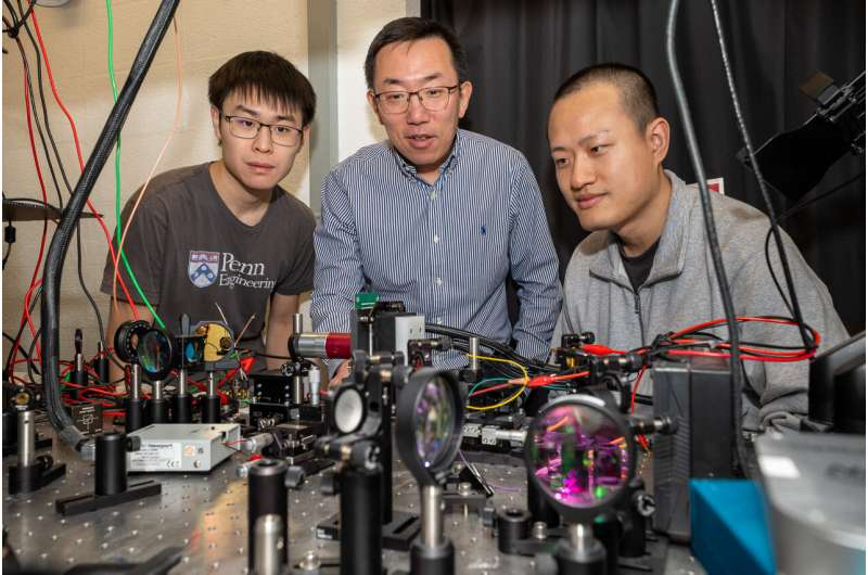 From left: co-authors Xilin Feng, Professor Liang Feng and Tianwei Wu with some of the equipment used to test the new technology. Credit: Sylvia Zhang, Penn Engineering