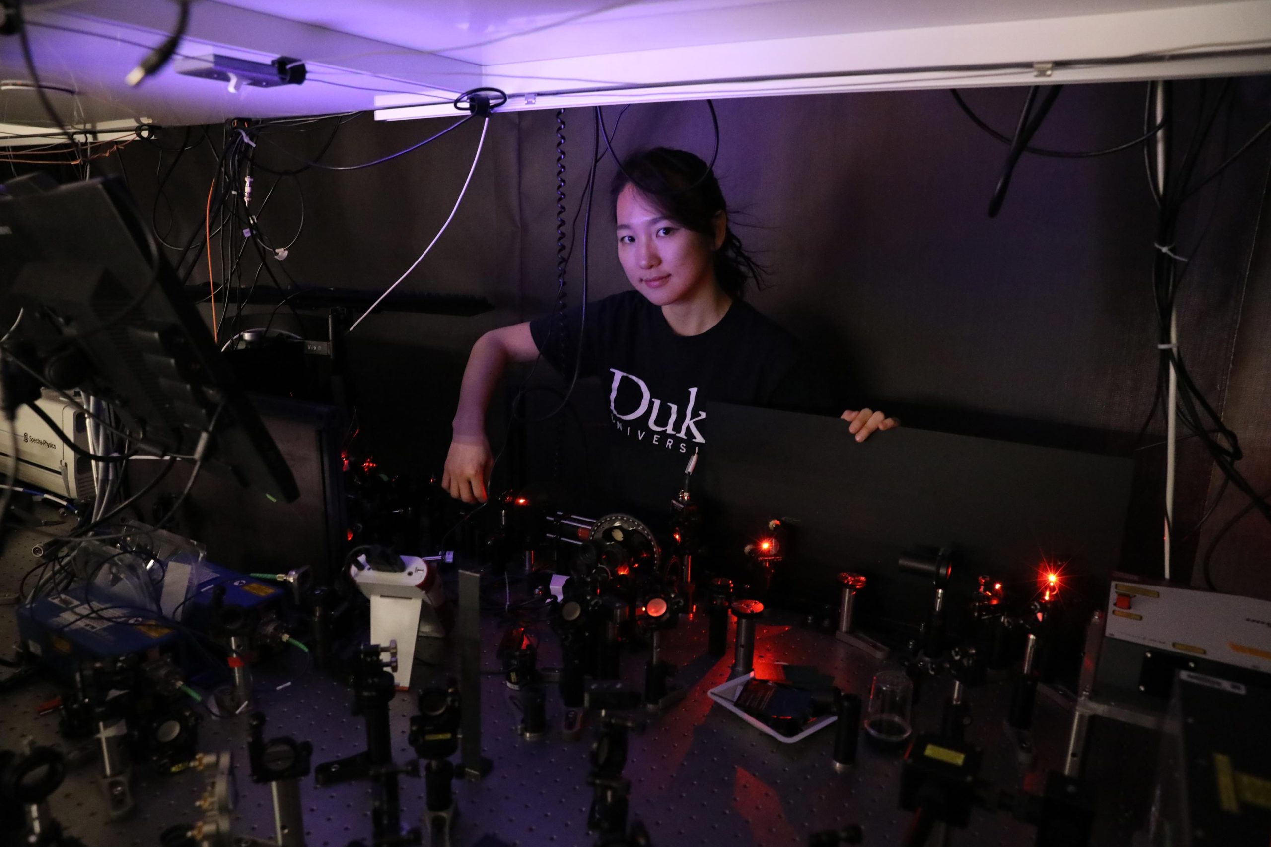 Duke graduate student Eunso Shin works on quantum computing research equipment in the Duke Quantum Center. Credit: Andrew Tie, Duke University