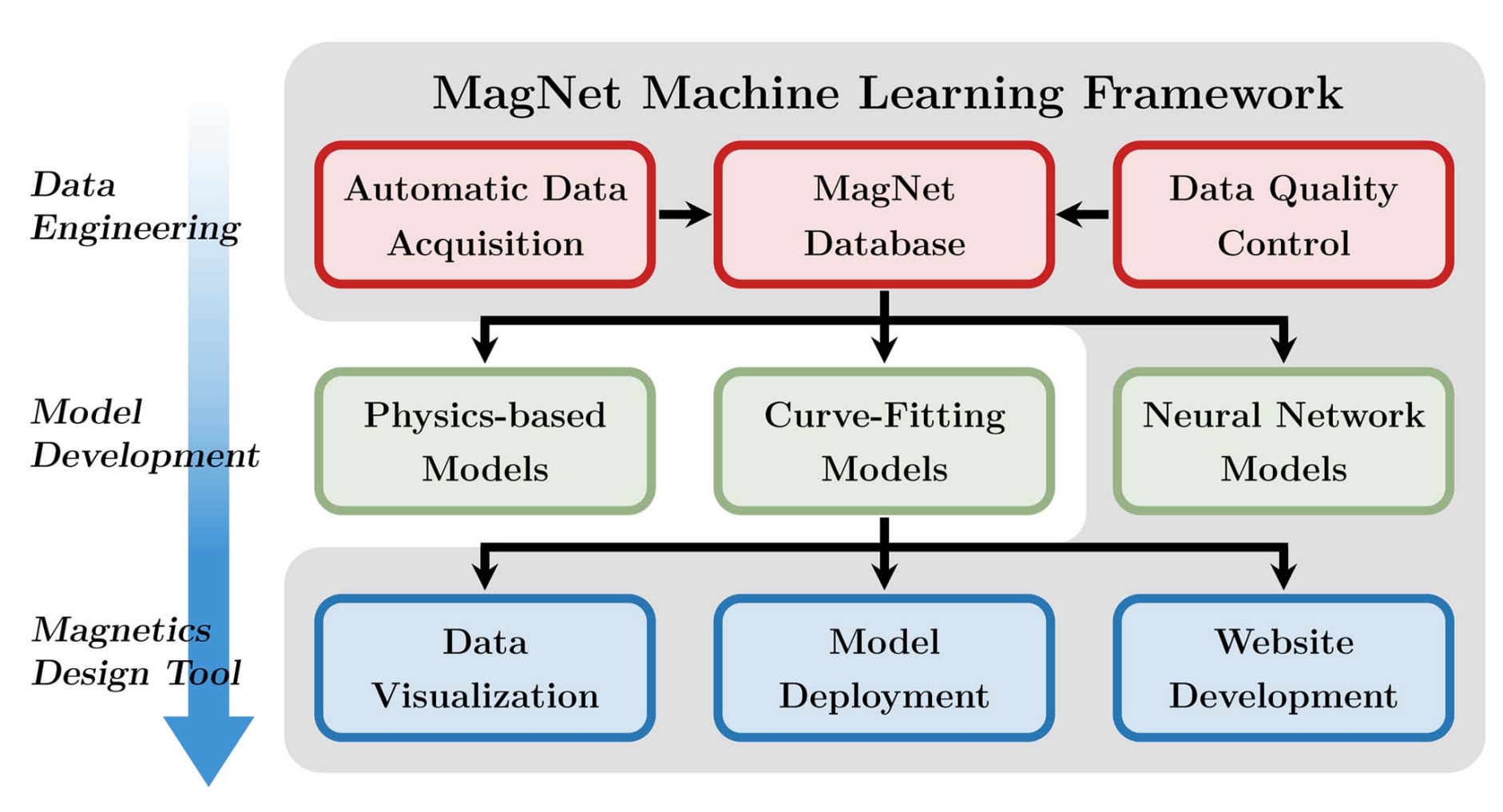 The database, which includes diverse, real-world measurements of voltage, current, and flux density, is designed to allow models to learn non-linear behaviors. Key elements in the Challenge include data engineering, model development, and a magnetic design tool (Figure 1).