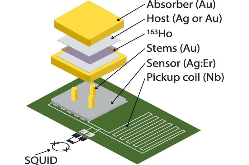Schematic drawing of an MMC pixel for the ECHo experiment. For visual clarity, the sensor and absorber are shown for only one of the two pixels, allowing the pickup coil underneath the other to be seen. Credit: Physical Review Letters (2026). DOI: 10.1103/lqkb-hylx